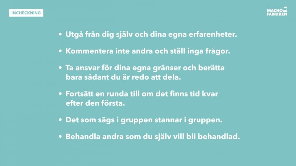 - De två personerna som sitter kvar ska sedan kort berätta vad de pratat om i relation till frågorna på bilden för de nya i gruppen.