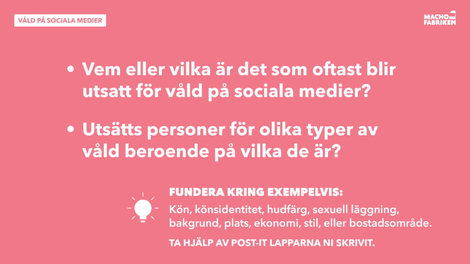Syfte: Att samla och sätta ord på deltagarnas erfarenheter av våld online, samt att få deltagarna att reflektera kring vad som är kränkande på nätet och vad dessa kränkningar får för konsekvenser på olika arenor.