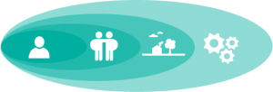 Vi jobbar med en helhetsmodell som vi kallar den socioekologiska modellen. Den visar på att vi behöver jobba på fler nivåer för att uppnå förändring.